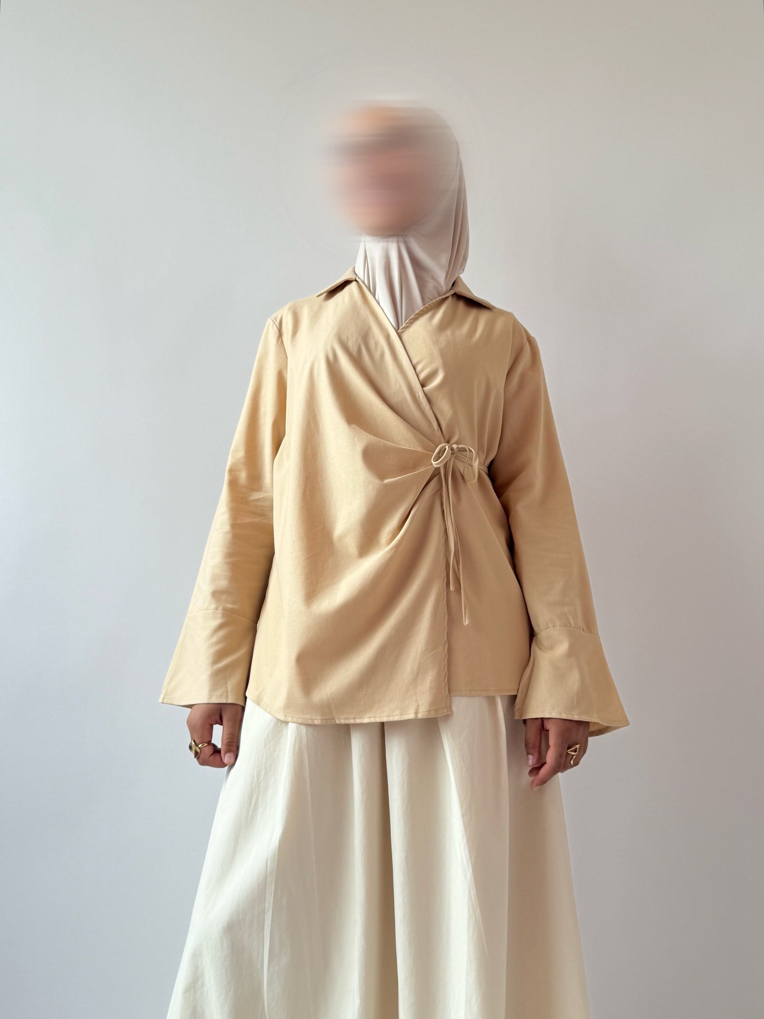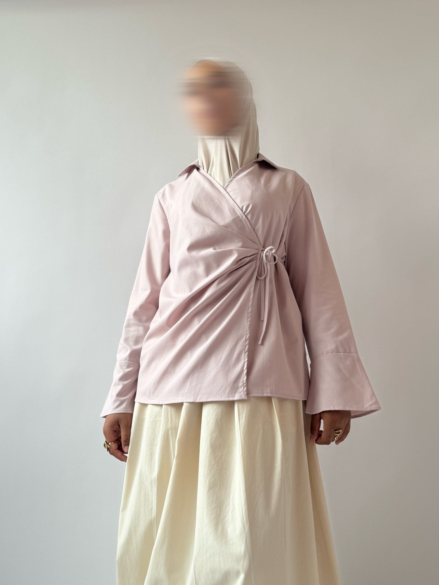 Blouse cache-cœur avec lien à nouer sur le côté. Manches longues, larges, avec fentes sur le bas.
