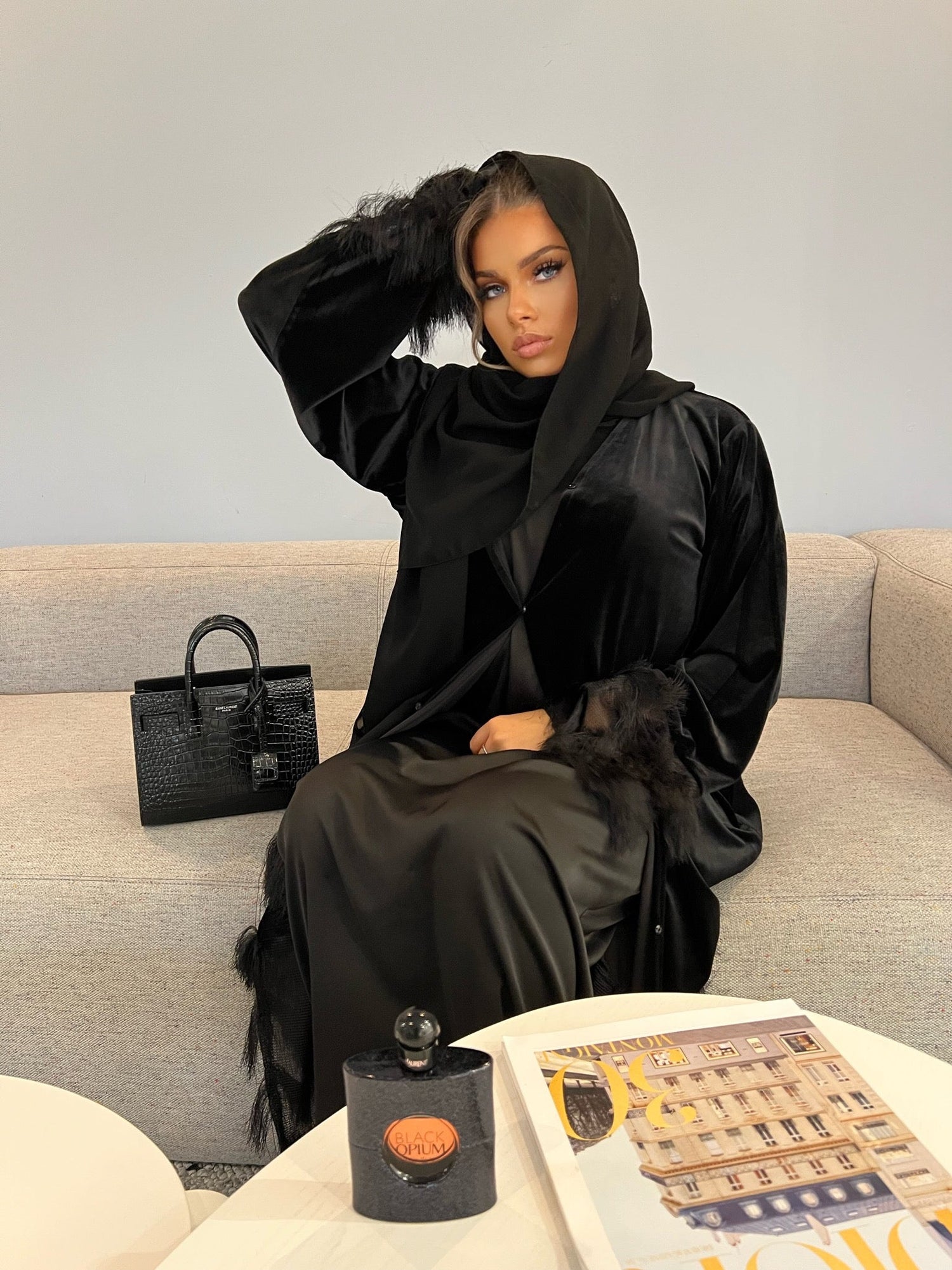 Les plumes délicates, habilement intégrées dans des sections stratégiques de l'abaya, créent un effet de mouvement et un contraste captivant avec la coupe fluide et minimaliste de la pièce. Que ce soit sur les manches, le bas de l'abaya, ou autour du col, chaque plume semble légère et aérée, apportant une touche de sophistication unique.