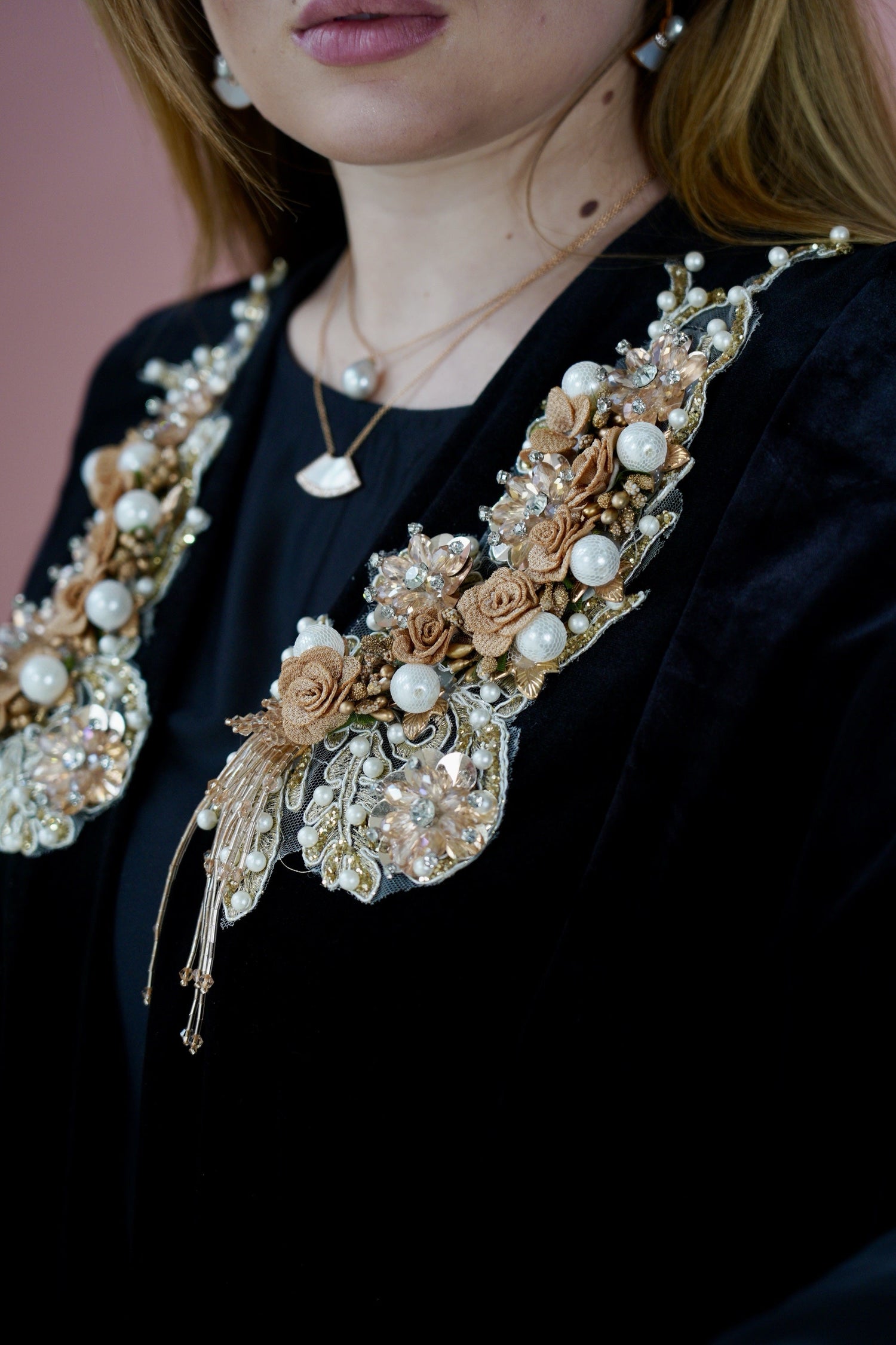 Velours Enchanté, pièce phare de notre collection, séduit par son allure majestueuse et son design sophistiqué. Cette cape abaya de luxe en velours noir somptueux est ornée de perles délicates et de fleurs en cuir au buste, alliant féminité et caractère.
